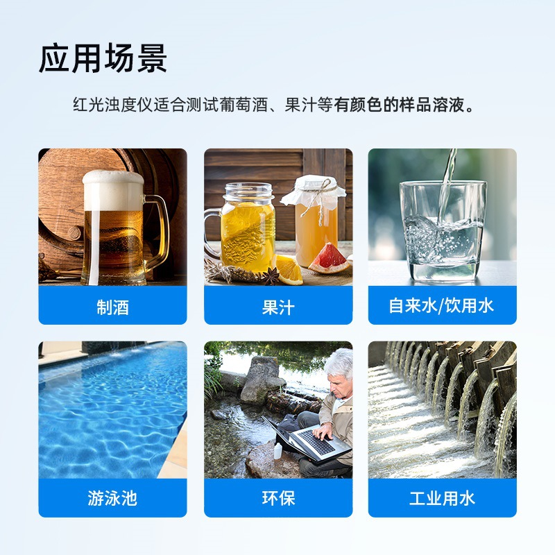 仪器采用 90°散射光测量,LED 光源(简称红光),波长 860±30nm,符合 HJ 1075-2019、ISO7027 和 DIN27027 标准 , 用于测量水溶液的浊度,适合在实验室或现场使用。红光光源不受溶液颜色干扰,可用于有颜色溶液的浊度测量。