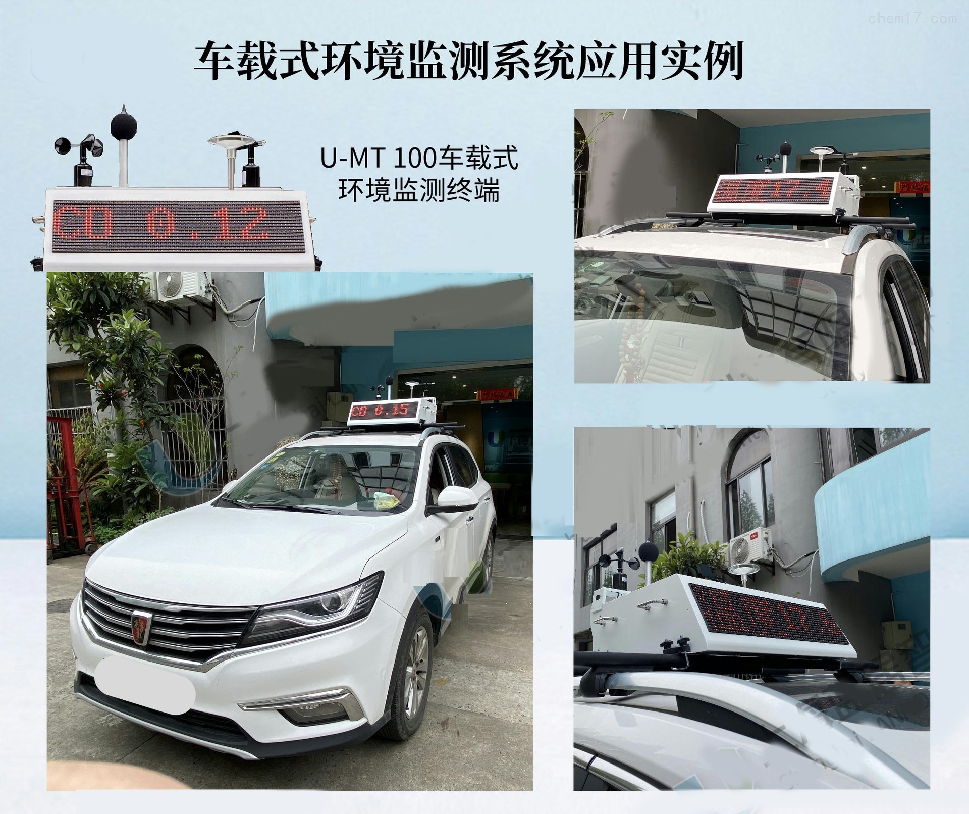 UMT100型车载式环境监测终端按照环境监测GB3095-2012《环境空气质量标准》,GB3096-2008《声环境质量标准》进行设计制造,满足环境监测和环境应急情况下对监测参数快速测量要求。产品具有高灵敏、高精度、实时监测系统,通过车载地图及GPS实时定位系统可把监测数值实时显示在车载电子地图上而且可叠加现场监控视频画面,为环境监测提供大数据和决策。