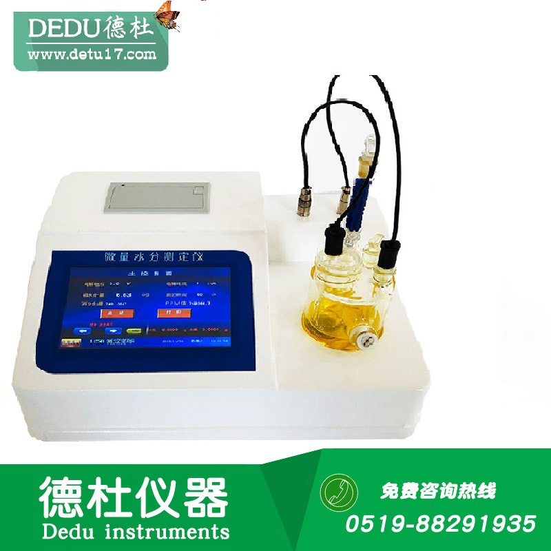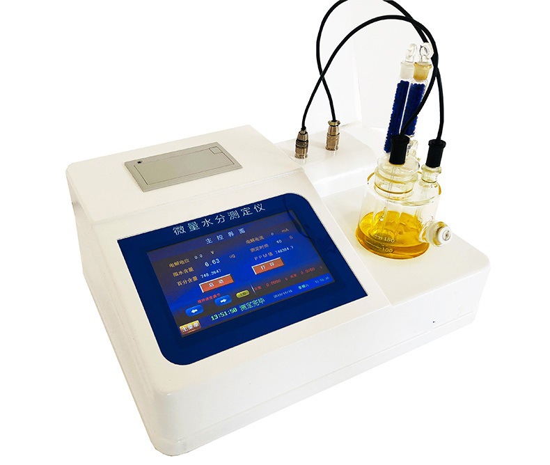 2.仪器具有试验结果存储、打印、计算功能;样品测定过程由仪器自动控制,搅拌、测定60秒左右自动完成,直接显示测定结果;全密封滴定池瓶,避免试剂与人接触,也避免环境湿度的影响;仪器中文液晶显示,并具有自动计算和打印功能,能打印出百分含量、样品编号、试验员、实验日期等内容;仪器准确度为:①水含量小于10微克水时,测量值误差小于2ug水;②水含量在10微克-1000微克水时,测量误差≤2ug水;③水含量在1000微克以上时,测量值误差≤0.2%(不含进样误差);