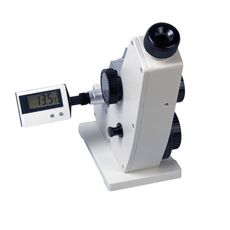 采用目视瞄准,光学度盘读数,温度数显,简单可靠。基座采用不锈钢材质,棱镜采用硬质玻璃,不易磨损。