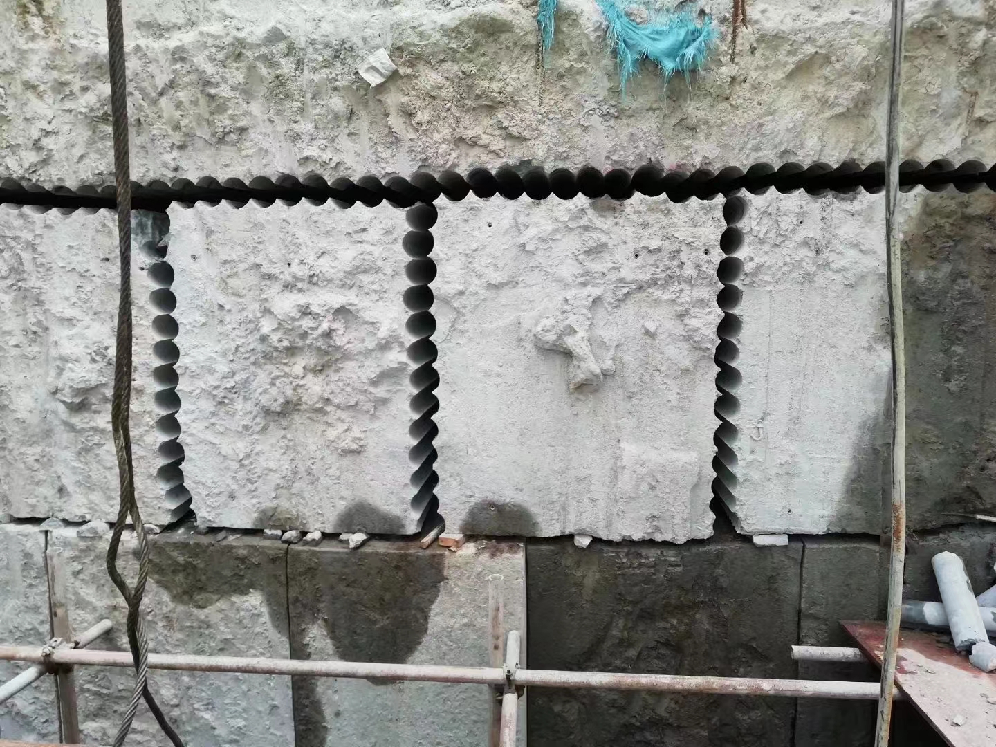 切割拆除:绳锯切割是金刚石绳索在液压马达驱动下绕被切割物高速行进研磨从而完成切割工作,利用绳锯设备对混凝土切割拆除,可以使钢筋混凝土的技术拆除更容易,更安全,更有效。降低了劳动强度,操作安全可靠,动力强劲,提高了切割拆除能力、工程效率,是拆除工程施工项目使用的先进设备。施工特点:可以进行任何方向的切割,切割不受被切割体大小、形状、切割深度的限制,广泛使用于大型钢筋砼构件的切割拆除。