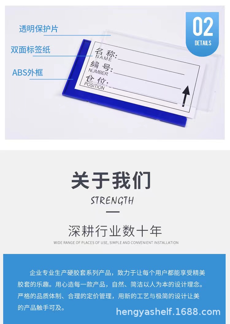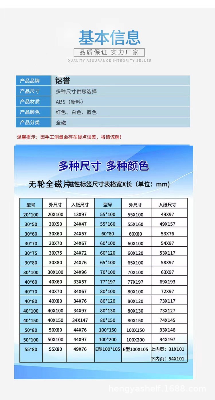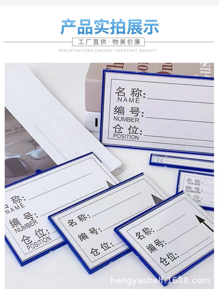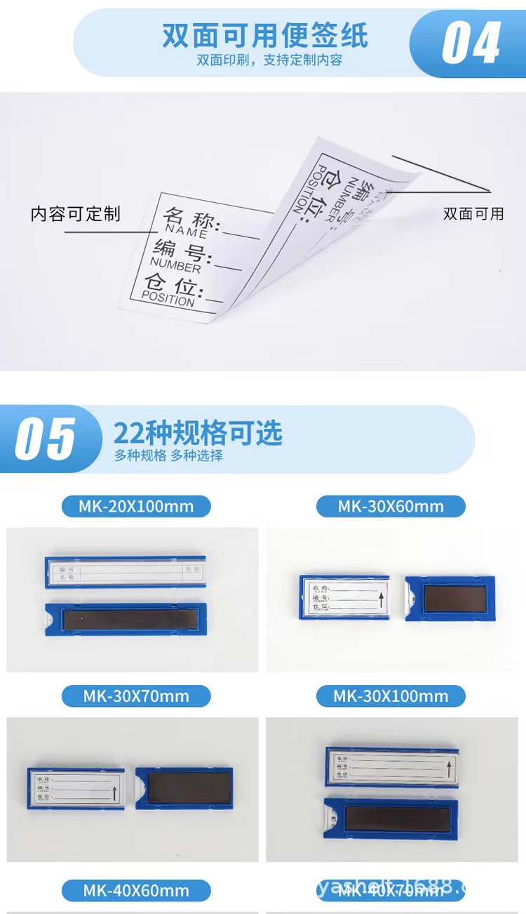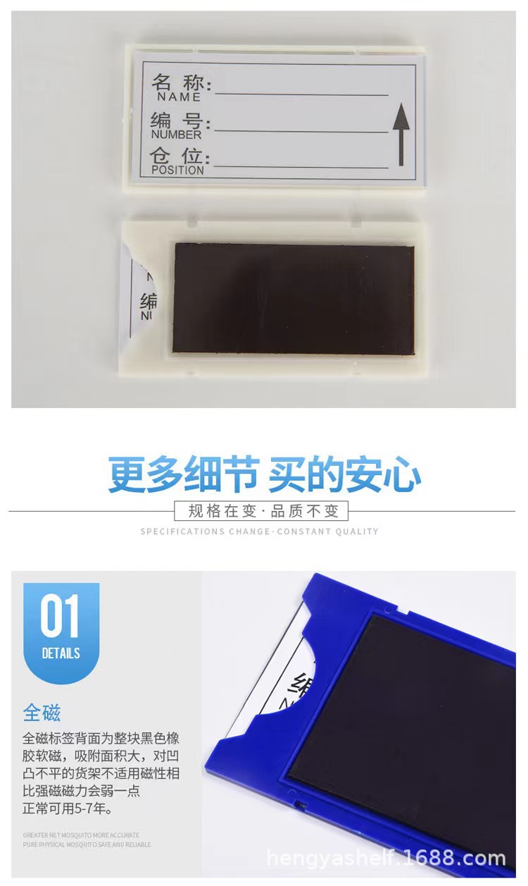 1、 普通型磁性标签正面插入资料卡片,可标识物品的名称、型号、规格和物料代码和数量等;