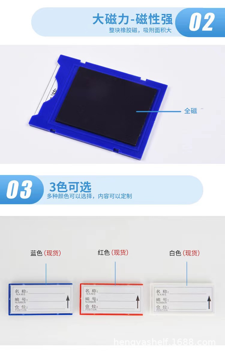 3.磁扣计数标签磁性标签可以直接吸附在货架、书架、文档架上,方便仓库、图书馆、资料馆管理的资料直观化,直接提升管理工作的效率。它的卡面信息可根据使用者的实际需要填写以及随时更换,因为是依靠磁面吸附,所以其位置可随意变动,方便快捷。