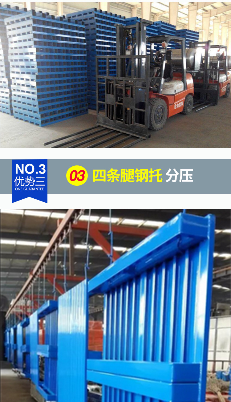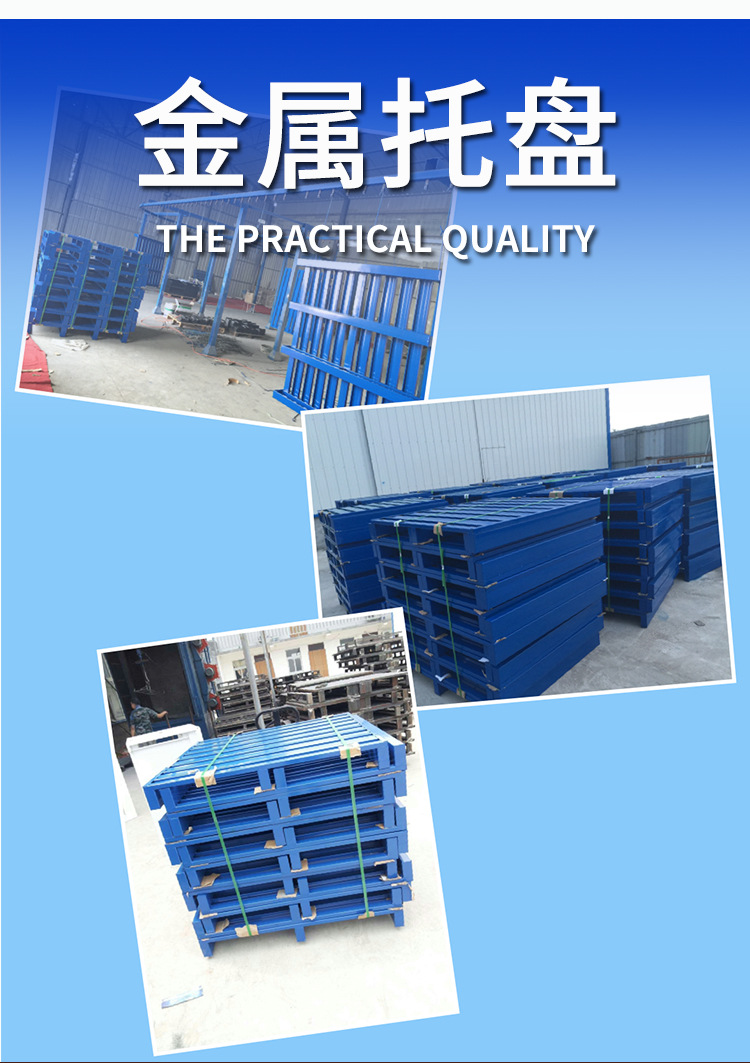 钢制托盘是一种用于机械化装卸、搬运和堆存货物的集装箱单元工具,基本结构由单层铺板下设纵梁或垫块、支腿等所组成,托盘的小高度以能方便使用叉车或托盘搬运车为原则。