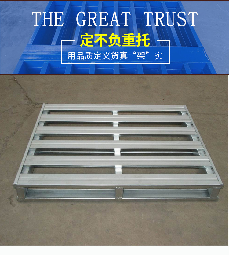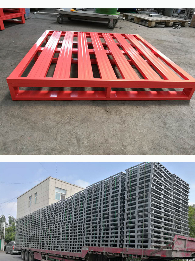 钢制托盘又叫金属托盘或铁托盘。钢制托盘(钢托盘)适合叉车作业,存取货物方便。主要材料为钢材或镀锌钢板,经专用设备成型,各种型材互相支撑,铆钉连接加强,再经CO2气体保护焊焊接而成。钢制托盘是一种用于机械化装卸、搬运和堆存货物的集装箱单元工具,基本结构由单层铺板下设纵梁或垫块、支腿等所组成,托盘的小高度以能方便使用叉车或托盘搬运车为原则。