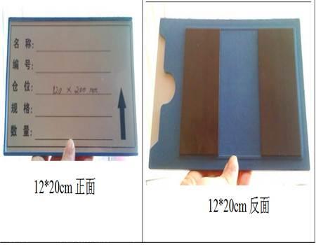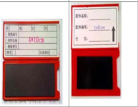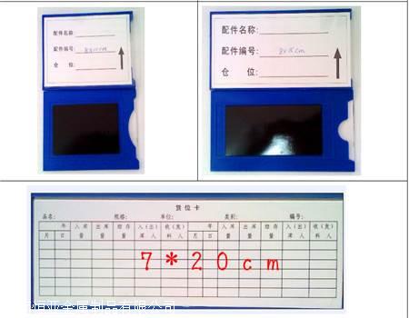 性标签是现代仓库管理中标签的一种,又叫磁性标牌、磁标签、材料卡、货位卡,由ABS工程塑料制成,是一种靠磁性吸附在文档架、书架、货架上标示该处物品信息的材料卡,其正面为物品信息标明面,背面是薄片方块关磁铁。常用于商场、文档室、图书馆、仓库等场所内。磁性标签按用途可分为普通型和计数器型两种。1、 普通型磁性标签正面插入资料卡片,可标识物品的名称、型号、规格和物料代码和数量等;