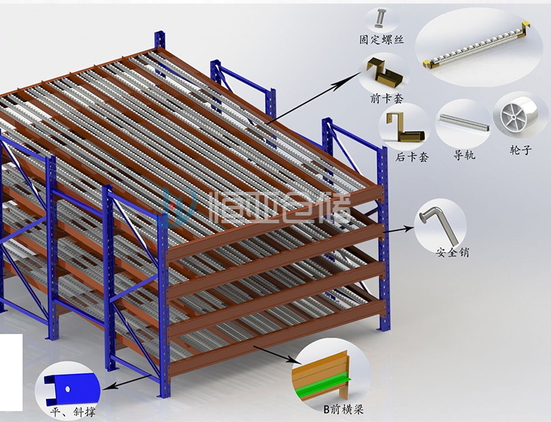 1、采用铝合金、钣金滚轮式流利条,利用货物自重实现先进先出。