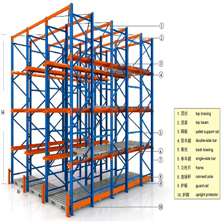 贯通式货架全插接组装式结构,柱片为装配式结构,靠墙区域的货架总深度一般好控制在7个托盘深度以内,中间区域可两边进出的货架总深度一般好控制在10个托盘深度以内,以提高叉车存取的效率和可靠性。