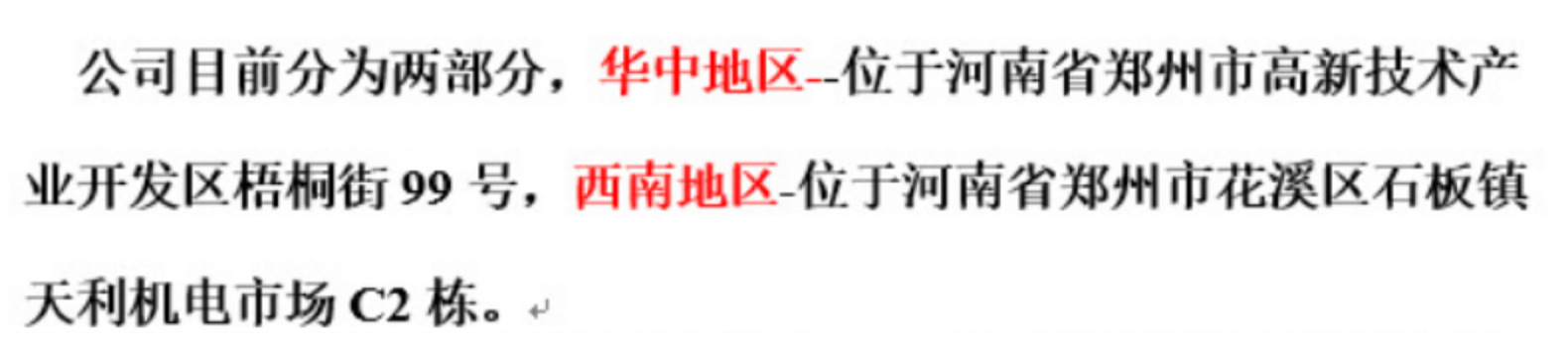 公司目前分为两部分,华中地区--位于贵州省郑州市高新技术产业开发区梧桐街99号,西南地区-位于贵州省贵阳市花溪区石板镇天利机电市场C2栋。