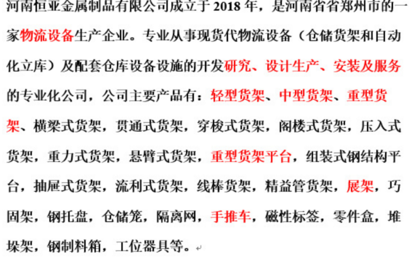 贵州恒誉金属制品有限公司成立于2018年,是贵州省贵阳市的一家物流设备生产企业。从事代物流设备(仓储货架和自动化立库)及配套仓库设备设施的开发研究、设计生产、安装及服务的公司,公司主要产品有:轻型货架、中型货架、重型货架、横梁式货架,贯通式货架,穿梭式货架,阁楼式货架,压入货架,重力货架,悬臂货架,重型货架平台,组装式钢结构平台,抽屉式货架,流利式货架,线棒货架,精益管货架,展架,巧固架,钢托盘,仓储笼,隔离网,手推车,登高梯,磁性标签,零件盒,堆垛架,钢制料箱,工位器具等。