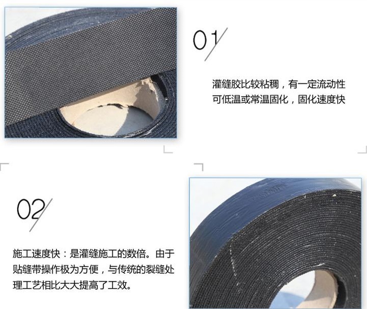 用自粘式贴缝带取代传统的沥青灌缝工艺。处理沥青路面裂缝,是目前公路养护技术的一大改进。传统工艺因受到沥青材料的低温冷脆性及高温软化性的限制,修补后的裂缝会随气温的变化经过一年的面层涨缩重新开裂。这一问题的存在,加重了路面养护维护的工作量和材料成本,而自粘式贴缝带在材料性能上克服了传统沥青材料存在的缺陷。
