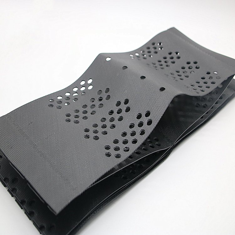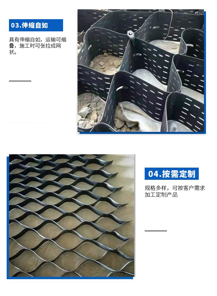 土工格室是由强化的HDPE片材料,经高焊接而形成的一种三维网状格室结构。一般经超声波针式焊接而成。因工程需要,有的在膜片上进行打孔。