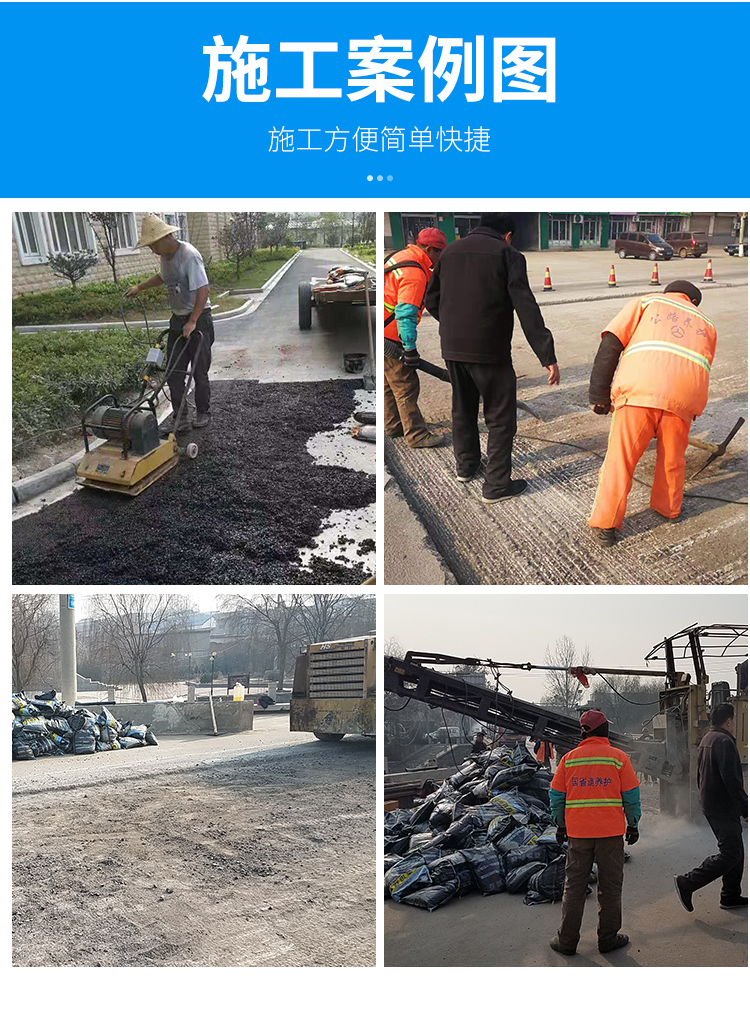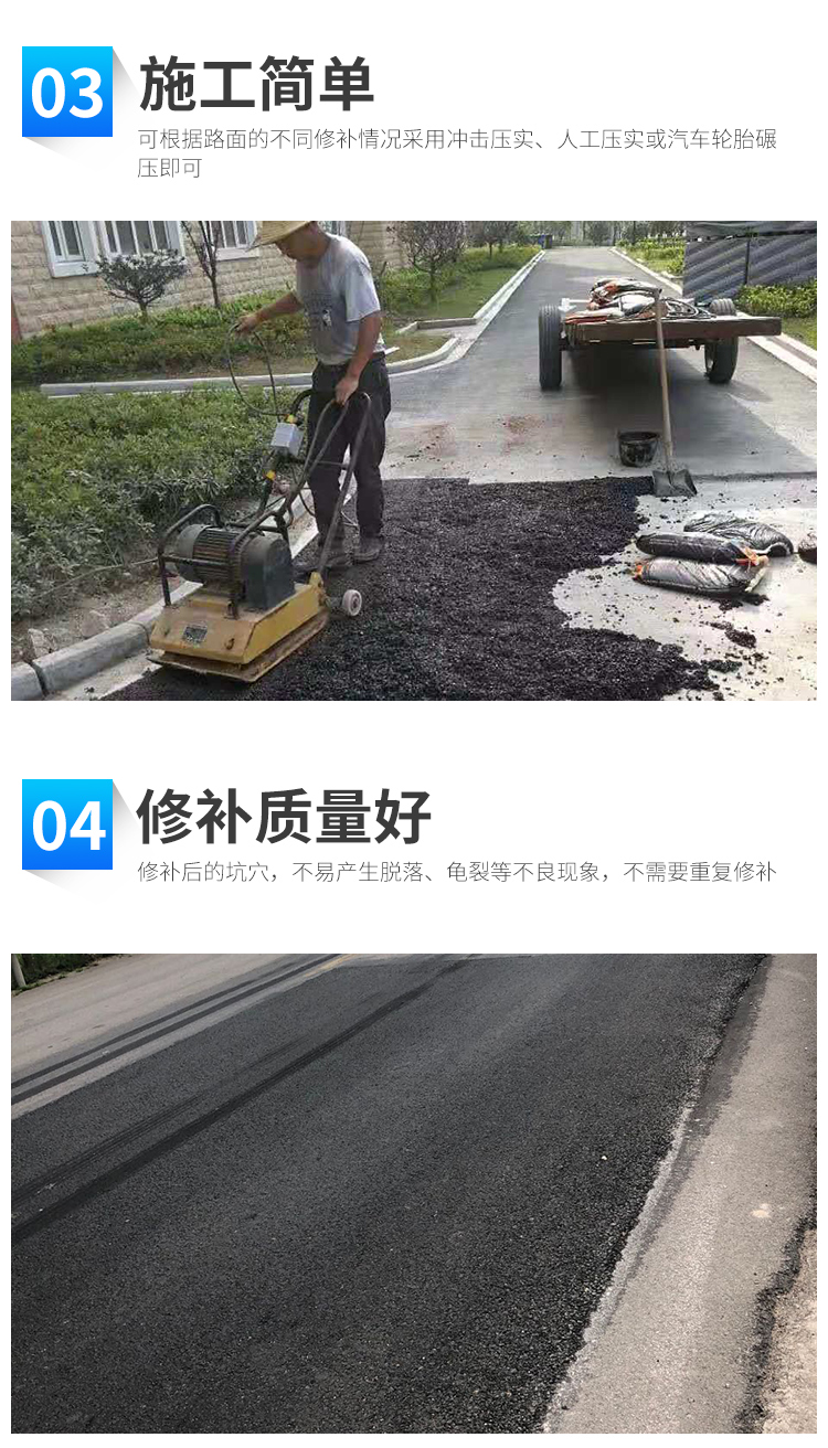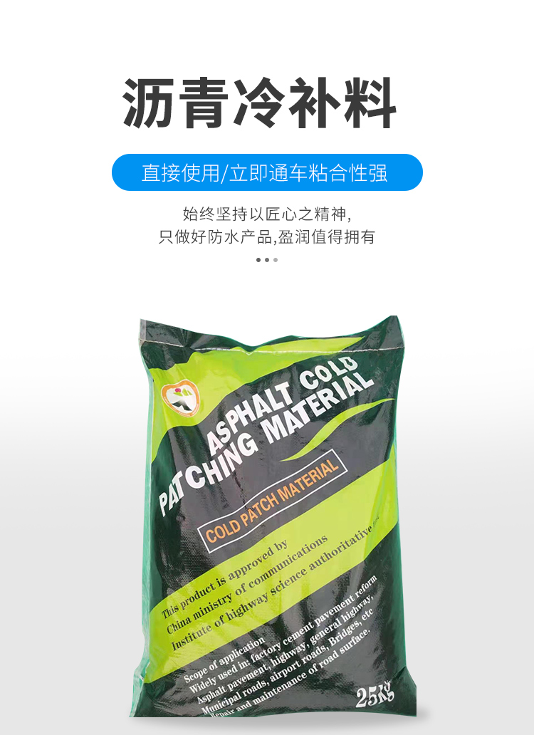 冷补料是一种高科技道路修补材料,可以全天候使用,适用于在任何天气和环境下补修各种不同类型的道路面层,如沥青混凝土道路、水泥混凝土道路、停车场、机场跑道等。