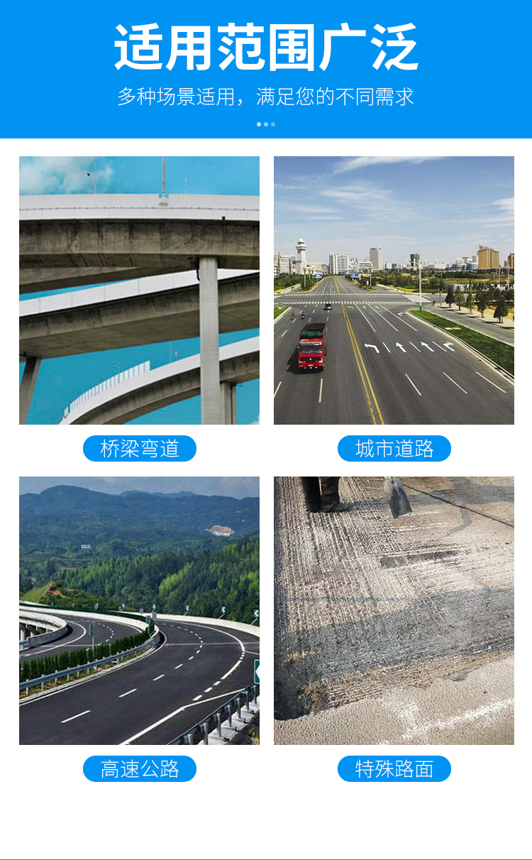 属 性 高科技道路修补材料 应 用 沥青、水泥混凝土道路;停车场;机场跑道