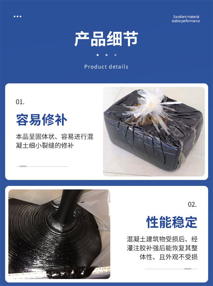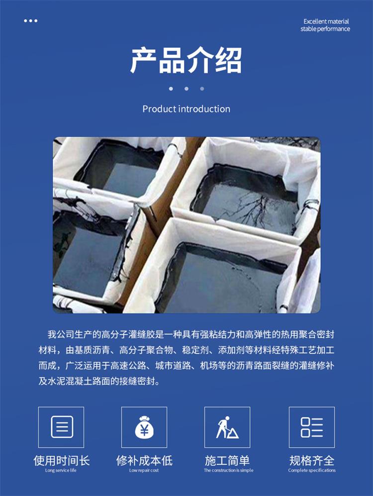 灌缝胶性能特点:灌缝胶为固态改性沥青和热塑橡胶的复合材料,热熔快,粘接性强,具有良好的抗形变恢复性能。与其它类型密封胶相比,该类型具有低稠度,易于渗入各种裂缝等特点。在夏季,其高温软化点可达96℃;在冬季,其耐低温可达近似-23℃,因此更适合在温差跨度大的温带环境。