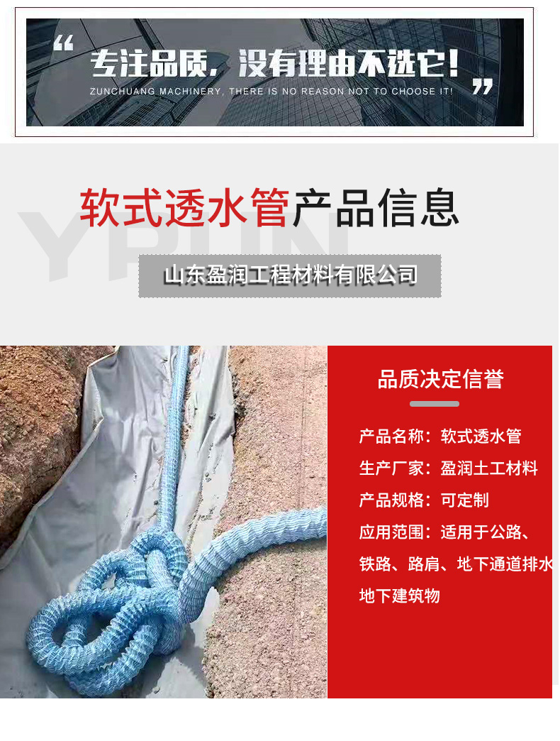 软式透水管是一种具有倒滤透(排)水作用的新型管材,因其产品特的设计原理和构成材料的优良性能,它排、渗水效果强,利用“毛细”现象和“虹吸”原理、集吸水、透水、排水为一气呵成,具有满足工程设计要求的耐压能力及透水性和反滤作用。