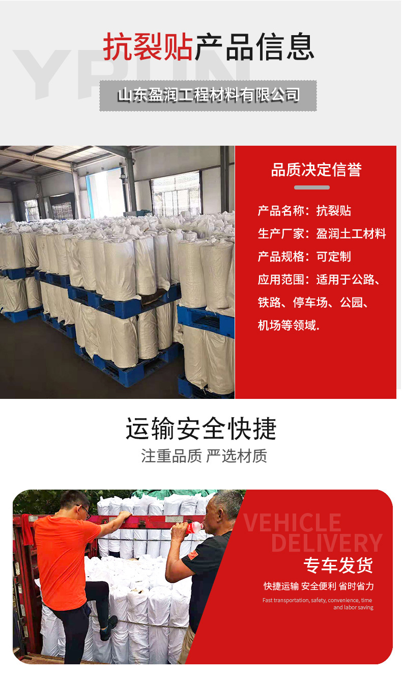 4、隔水防渗作用。防裂贴(又称抗裂贴)高聚物能形成一完整的隔水防渗层,可隔断路面水向路基渗透,从而保护基层的强度,使基层材料性质不至于进一步恶化。抗裂贴用于沥青路面层可有效抑制裂缝向上传递,在实际工程中发挥抗裂贴的抗裂作用及吸能作用。