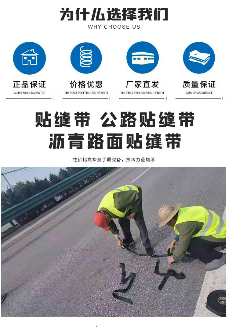 路面贴缝带优点:操作简便使用路面裂缝贴缝带修补路面裂缝时,不需要对贴缝带进行任何加工或处理,就象日常生活中使用“创可贴”一样,一贴即可。普通工人5分钟就能掌握施工技巧。施工速度快路面裂缝贴缝带处理裂缝的速度较用密封胶灌缝的速度快。