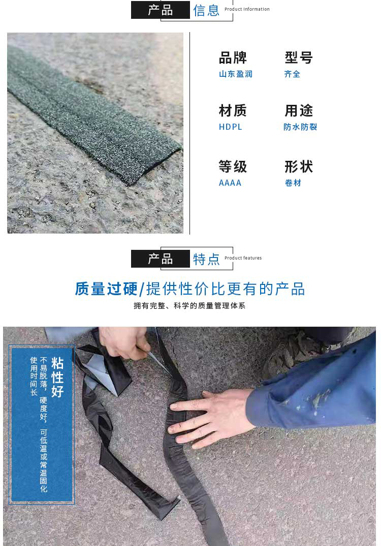 自粘压缝带在沥青面层中,能够将车轮接触的下面层压力和轮载边缘以外区域受到的应力吸收分散,在两块受力区域之间形成缓冲带,使此处应力逐步减小,减少应力集中对沥青面层的破坏,从而有效的延长路面的寿命。高稳定性,自粘压缝带能够承受185℃以下的高温,同时凭借其良好的抗拉强度及粘结性可以将下层裂缝两侧连接起来,形成整体防护层和阻止水破坏的隔离层。