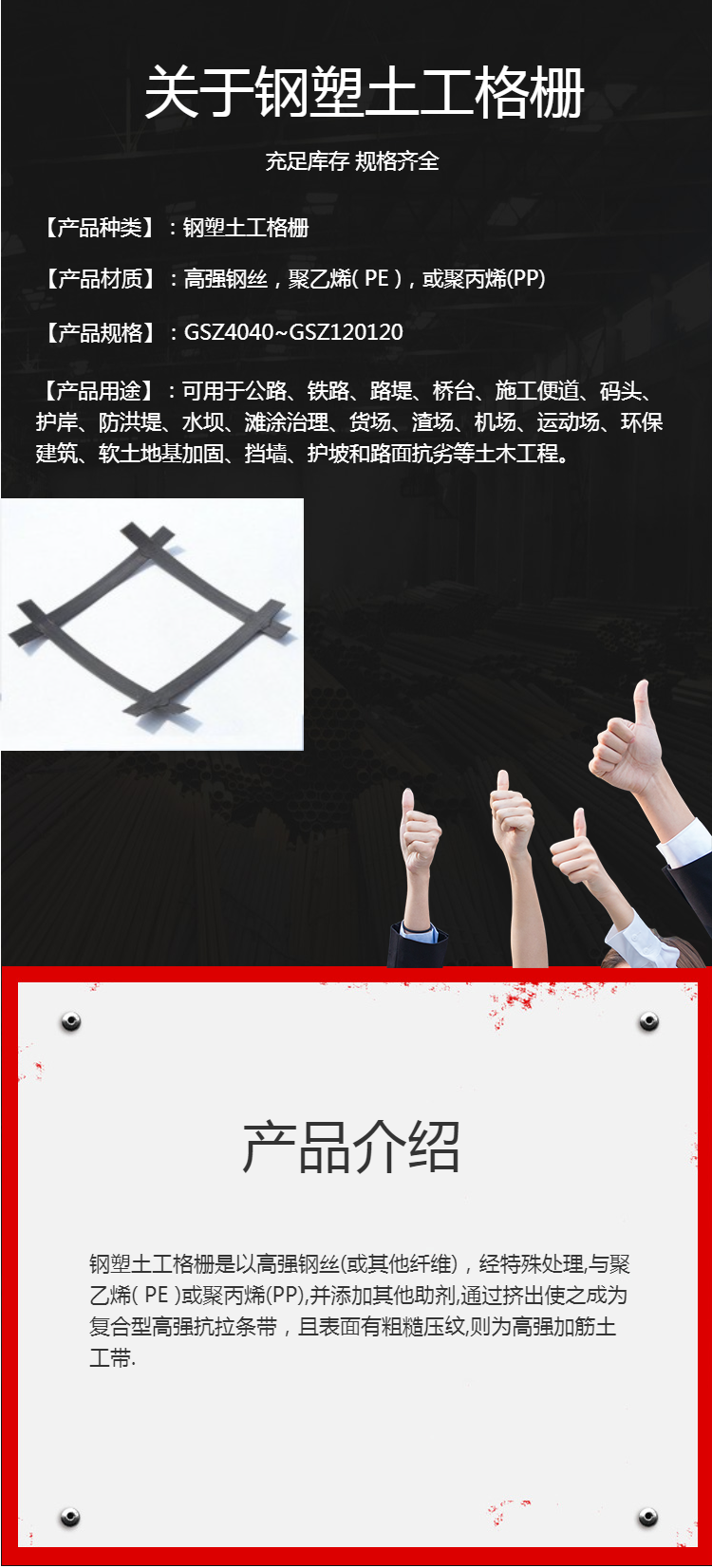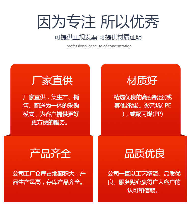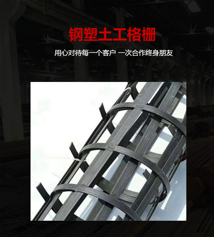 高强钢丝格栅是先把横、纵向的多单根高强钢丝经电阻焊焊接成方孔型,再把焊接成型的钢丝涂覆塑料而成的一种新型的加筋格栅。