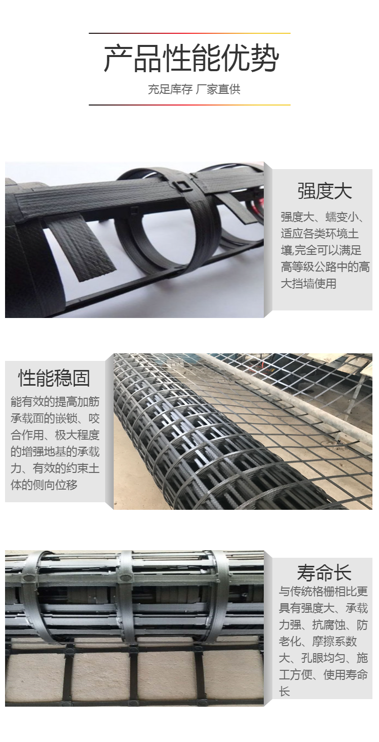 工程应用领域: 公路、铁路、桥台、引道、码头、水坝、渣场等的软土地基加固、挡墙和路面抗裂工程等领域。