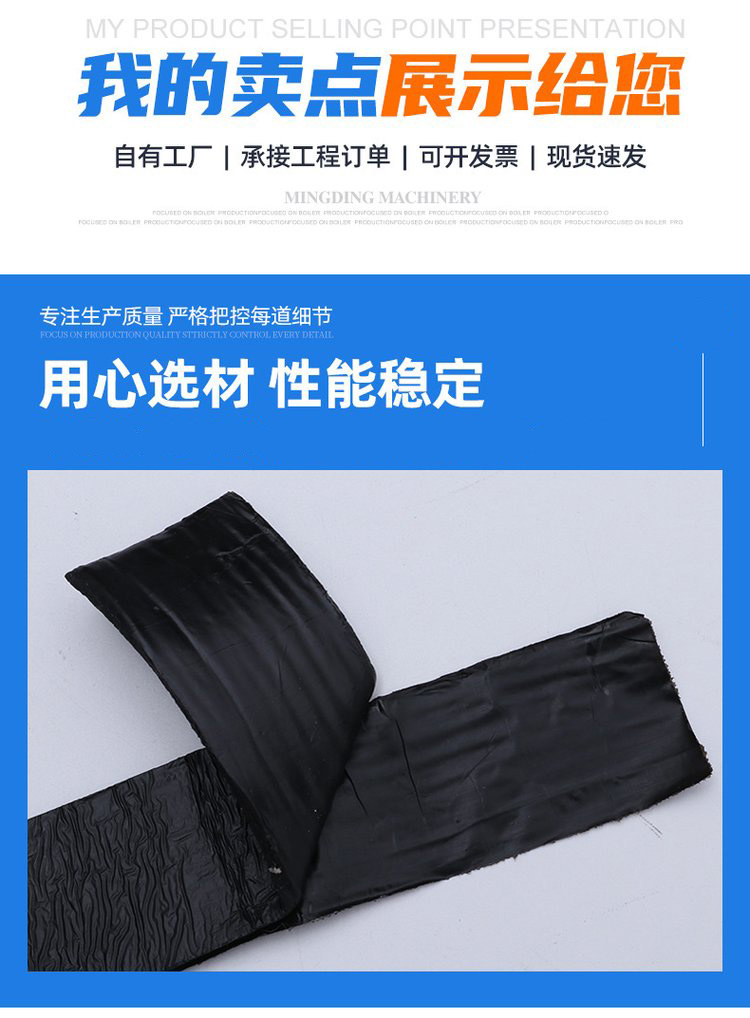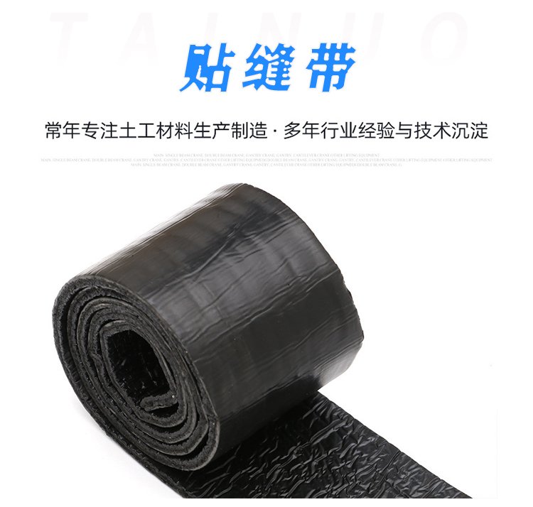 3、贴缝带粘结,选取好压缝带的尺寸,除去隔离纸,沿裂缝走向粘贴到裂缝上。粘贴时一只手拿住压缝带,另一只手拇指于食指捏住压缝带顺裂缝走向稍用力粘结,同时保证裂缝两侧压缝带富余宽度一致,若是较长的裂缝可一只手拿压缝带另一种收拉住隔离纸,然后用脚踩压到裂缝上,保证裂缝贴住,防止渗水。