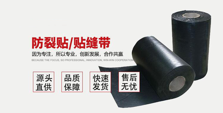 3、贴缝带粘结,选取好压缝带的尺寸,除去隔离纸,沿裂缝走向粘贴到裂缝上。粘贴时一只手拿住压缝带,另一只手拇指于食指捏住压缝带顺裂缝走向稍用力粘结,同时保证裂缝两侧压缝带富余宽度一致,若是较长的裂缝可一只手拿压缝带另一种收拉住隔离纸,然后用脚踩压到裂缝上,保证裂缝贴住,防止渗水。