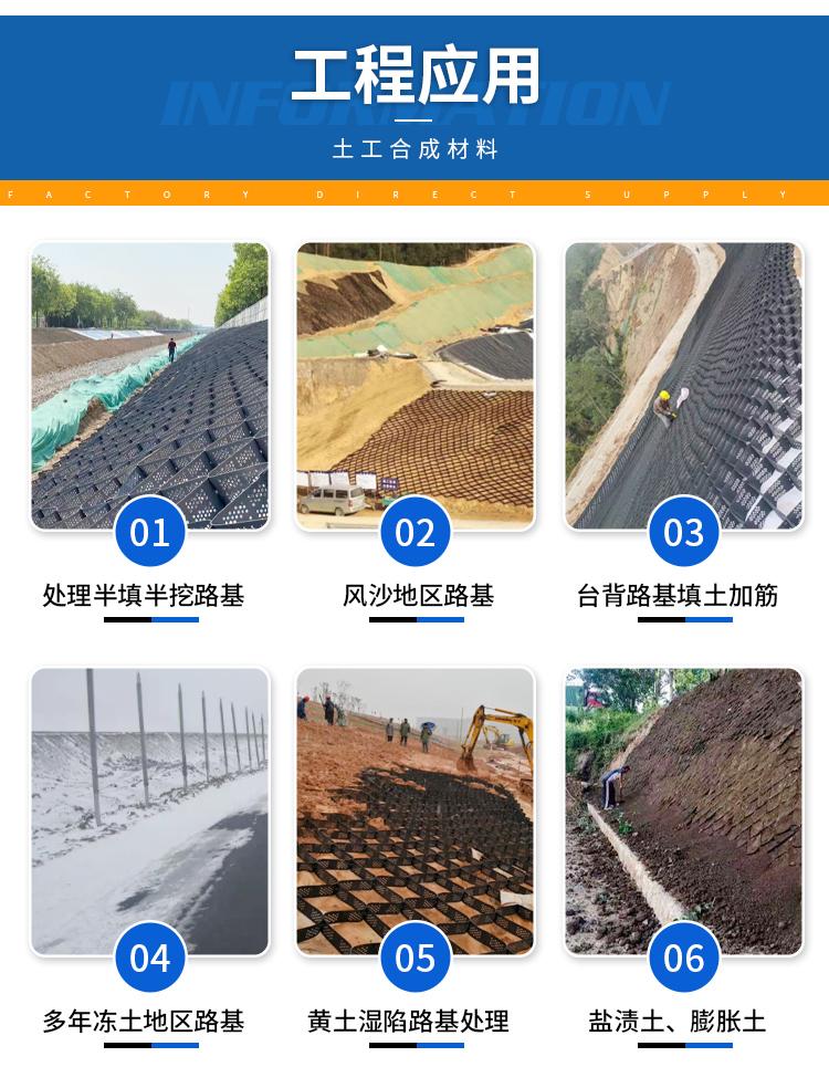 1、具有伸缩自如,运输可缩叠,施工时可张拉成网状,填入泥土、碎石、混凝土等松散物料,构成具有强大侧向限制和大刚度的结构体。