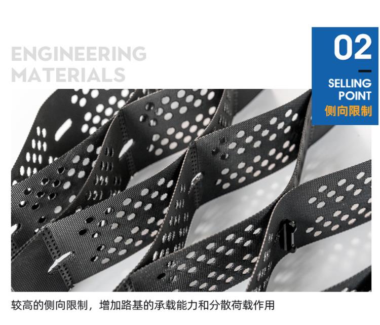 1用于稳固公路路基:可产生高弹性力及坚固的路基,与传统的石头基础相比可减少基础厚度50%以上,把重力和与地接触的压力横向分散并减少,并可用于暂时性的道路建筑上。