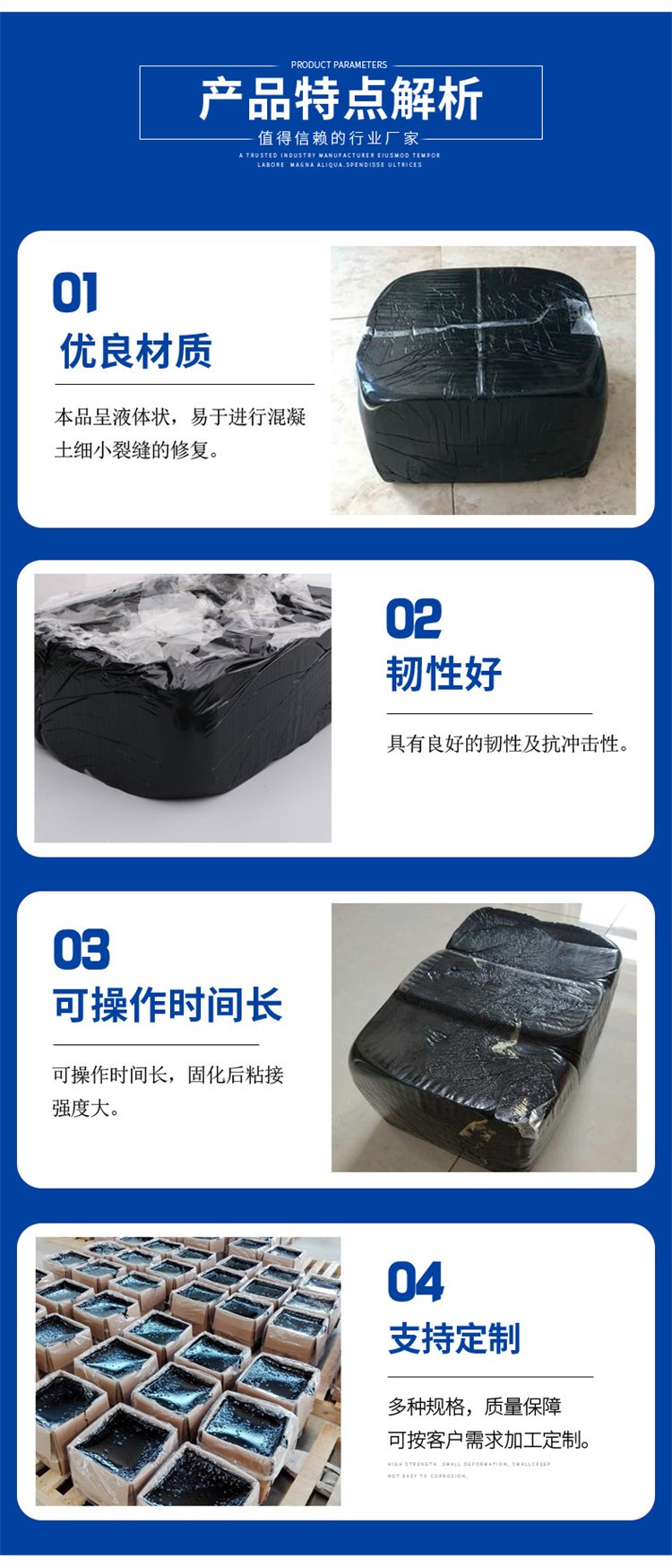灌缝胶详情介绍道路灌缝胶 简介:道路灌缝胶,又称道路密封胶、道路填缝料。主要用于路面裂缝的修复。灌注工艺简单,固化速度快,固化后粘接强度高、韧性好。达到低温-30抗裂,高温70度稳定性强。耐酸碱性能好,防水防油防尘,耐湿热和大气老化。具有良好的抗张、耐压及粘接强度。灌缝胶道路灌缝胶 简介:道路灌缝胶,又称道路密封胶、道路填缝料。主要用于路面裂缝的修复。灌注工艺简单,固化速度快,固化后粘接强度高、韧性好。达到低温-30抗裂,高温70度稳定性强。耐酸碱性能好,防水防油防尘,耐湿热和大气老化。具有良好的抗张、耐压及粘接强度。