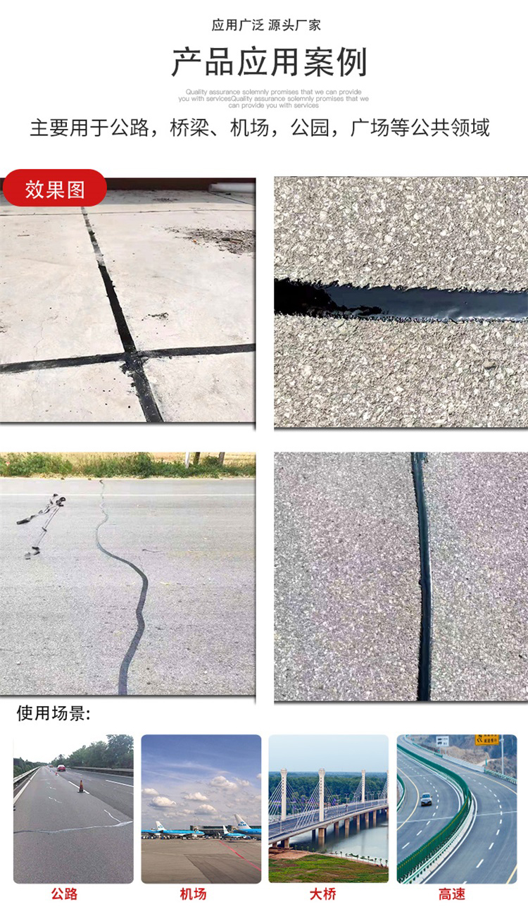 道路密封胶路面嵌缝胶路面裂缝修补剂,路面嵌缝胶、嵌缝胶价格、嵌缝胶厂家、路面灌缝胶,水泥沥青路面裂缝用什么材料修补好?路面嵌缝胶是一款专门为解决路面裂缝病害而研制的一款路面裂缝修补材料,是一种具有强粘结力和高弹性的热用聚合密封材料,又名路面嵌缝胶,由基质沥青、高分子聚合物、稳定剂、添加剂等材料经特殊工艺加工而成,广泛运用于高速公路、高等级公路、城市公路、机场等的聚氨酯路面裂缝灌缝胶及水泥混凝土路面的接缝密封。