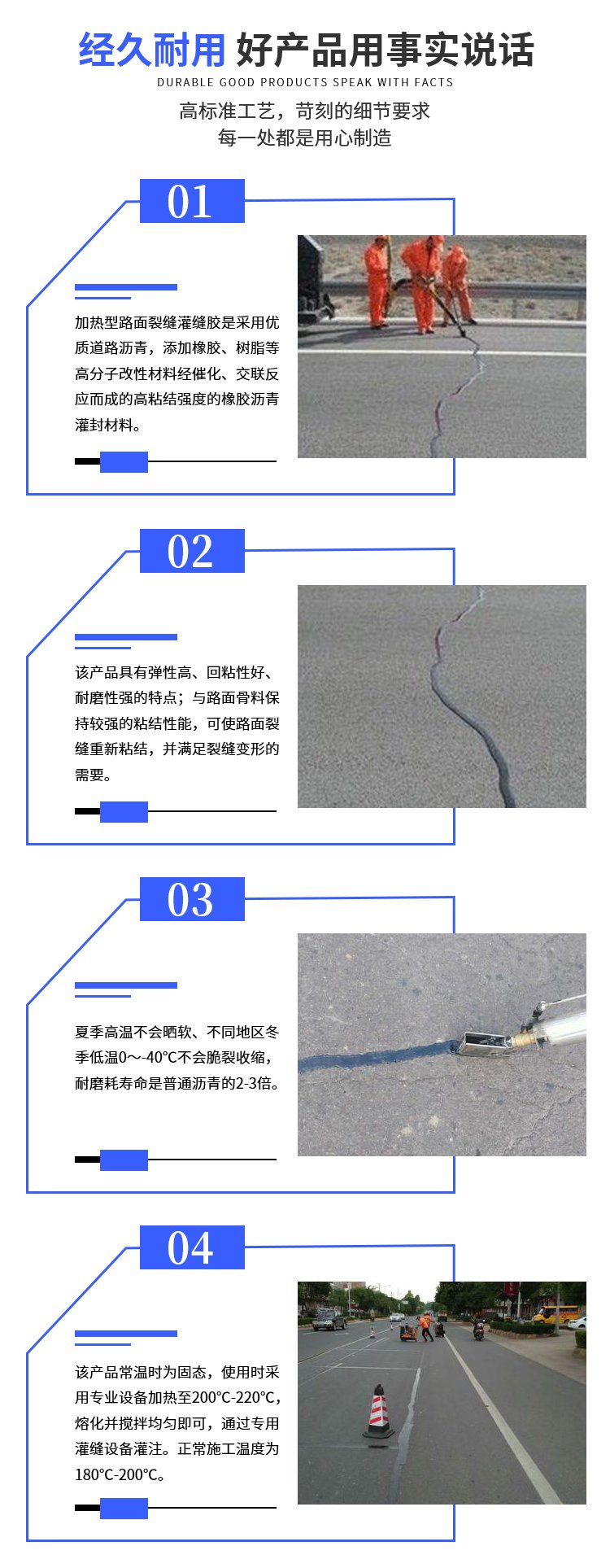 公司通过研究分析不同路况的裂缝,在进行综合分析研究的前提下,精选改性沥青、高分子聚合物、各种稳定剂等原材料,经既定配比研发生产的热熔型聚合物密封胶!