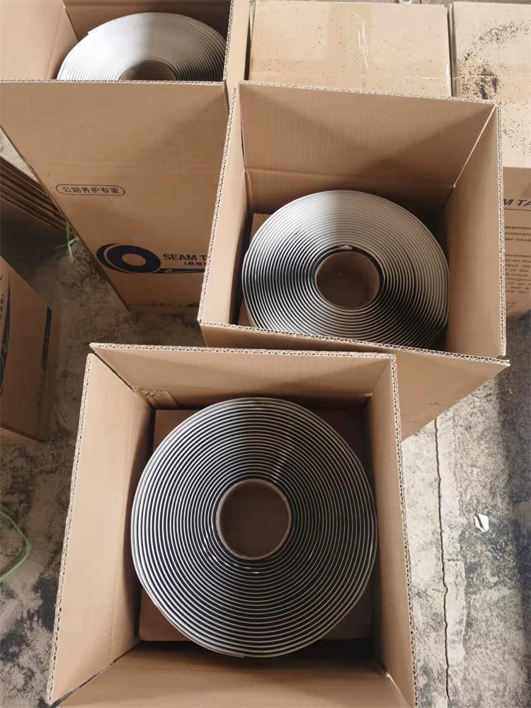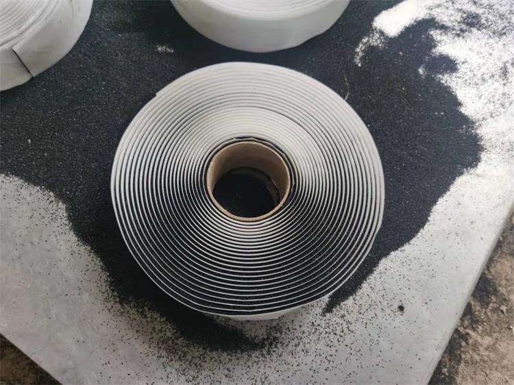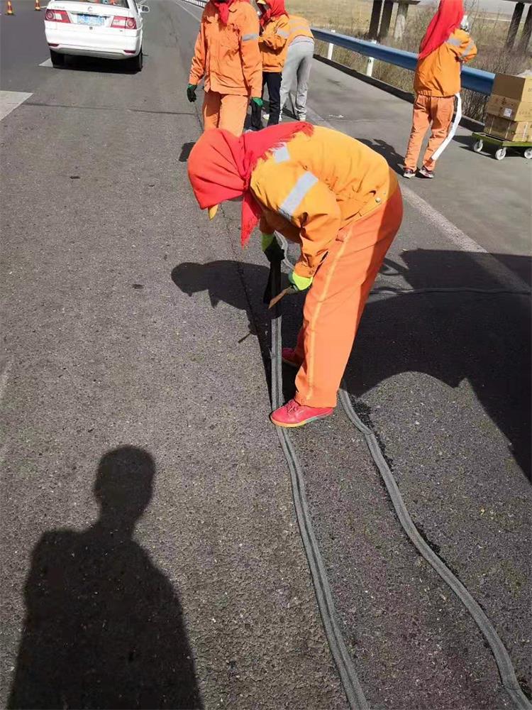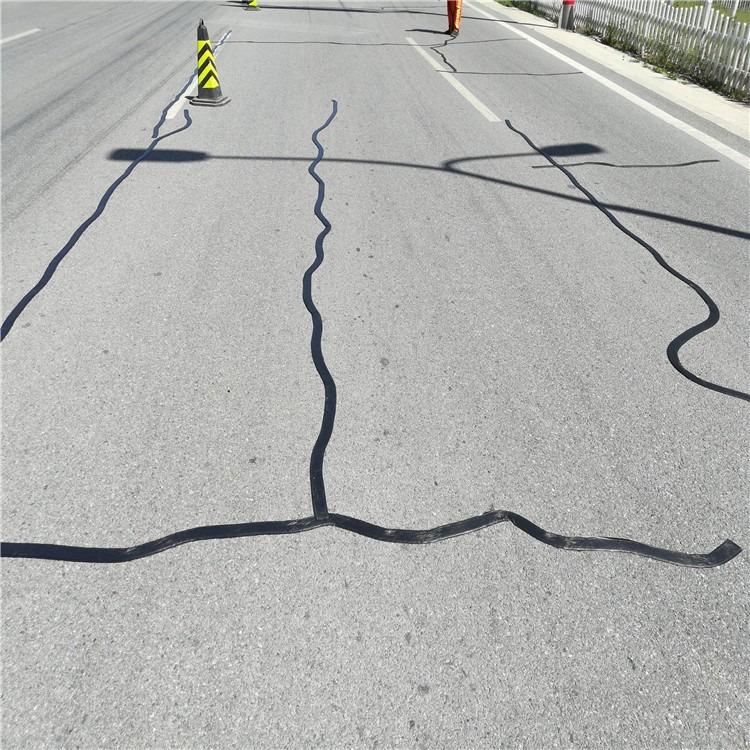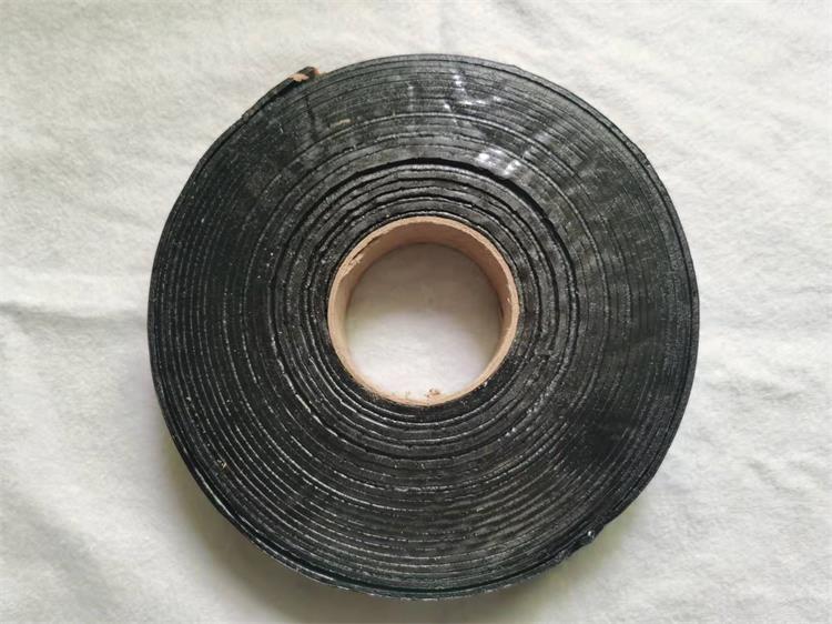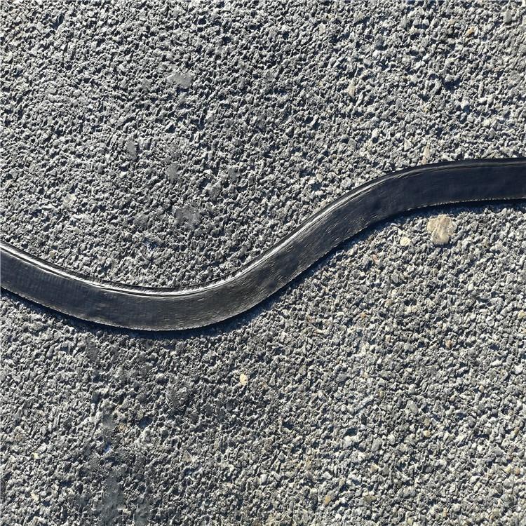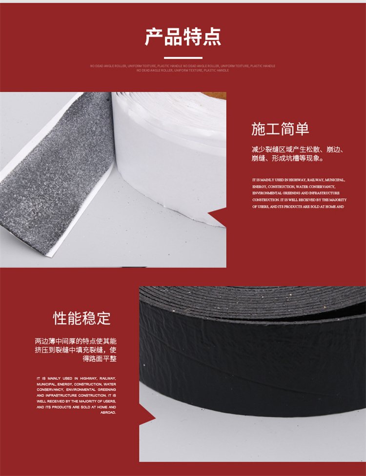 自粘式压缝带是沥青聚合物、合成橡胶、高分子聚酯弹性材料、高强机织布复合生成的一种有柔韧性、耐冲击性、抗撕裂,又具有良好的自粘性的新型封缝材料。压缝带以沥青聚合物为胎基,虽然经过了改性,但其仍具有沥青的特征形态,基质沥青聚合物具有极强的感温性,随着温度的变化由低到高,沥青聚合物的物质形态表现为玻璃态、弹性态、粘稠态和液态四个特征形态,也就是说在不同温度区间段,表现出的物质形态和物质特征也有所不同。在正常的使用范围内表现微弹性态和粘稠态,这事保证压缝带能安全使用的基本特征。自粘式压缝带面层的高强机织物是主要的受力层,具有高强抗拉、抗剪切能力,保证了压缝带的使用寿命。压缝带在经过车辆的反复碾压后,材料中的聚酯物会从面层机织物中渗出与路面粘为一体。
