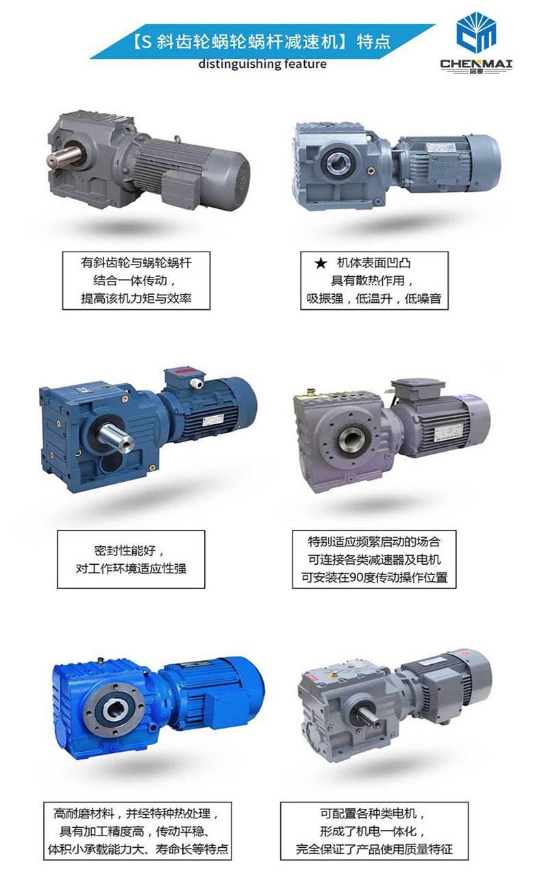 1、S系列斜齿轮蜗杆减速电机具有很高的科技含量,有斜齿轮与蜗轮蜗杆结合一体传动,提高该机力矩与效率。该系列产品规格齐全,转速范围广,通用性好,适应各种安装方式,性能安全可靠寿命长,实施了国际标准要求。