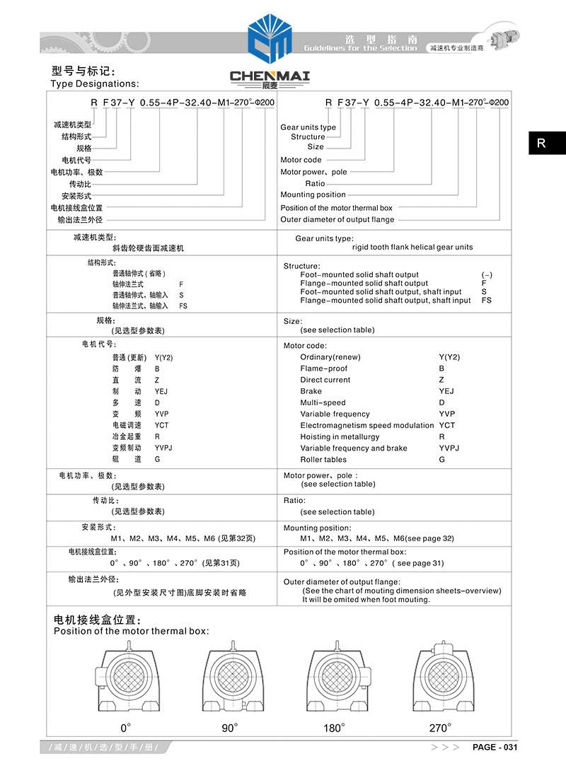 结构形式:R轴伸式底脚安装;RF:法兰安装;R…F:底脚法兰安装;RM: 法兰安装带加长轴承箱;RX:单级底脚安装;RXF:单级法兰安装。