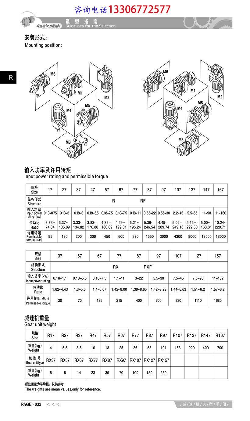 速比范围:R基本型3.33~289.74,RX型1.3~8.65,R/R组合型可达到27001