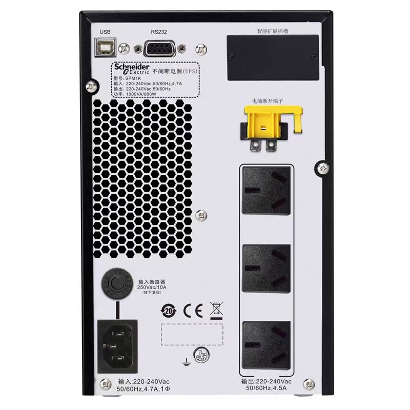支持SNMP/USB/RS232接口,兼容施耐德PowerChute软件(远程监控、自动关机)。