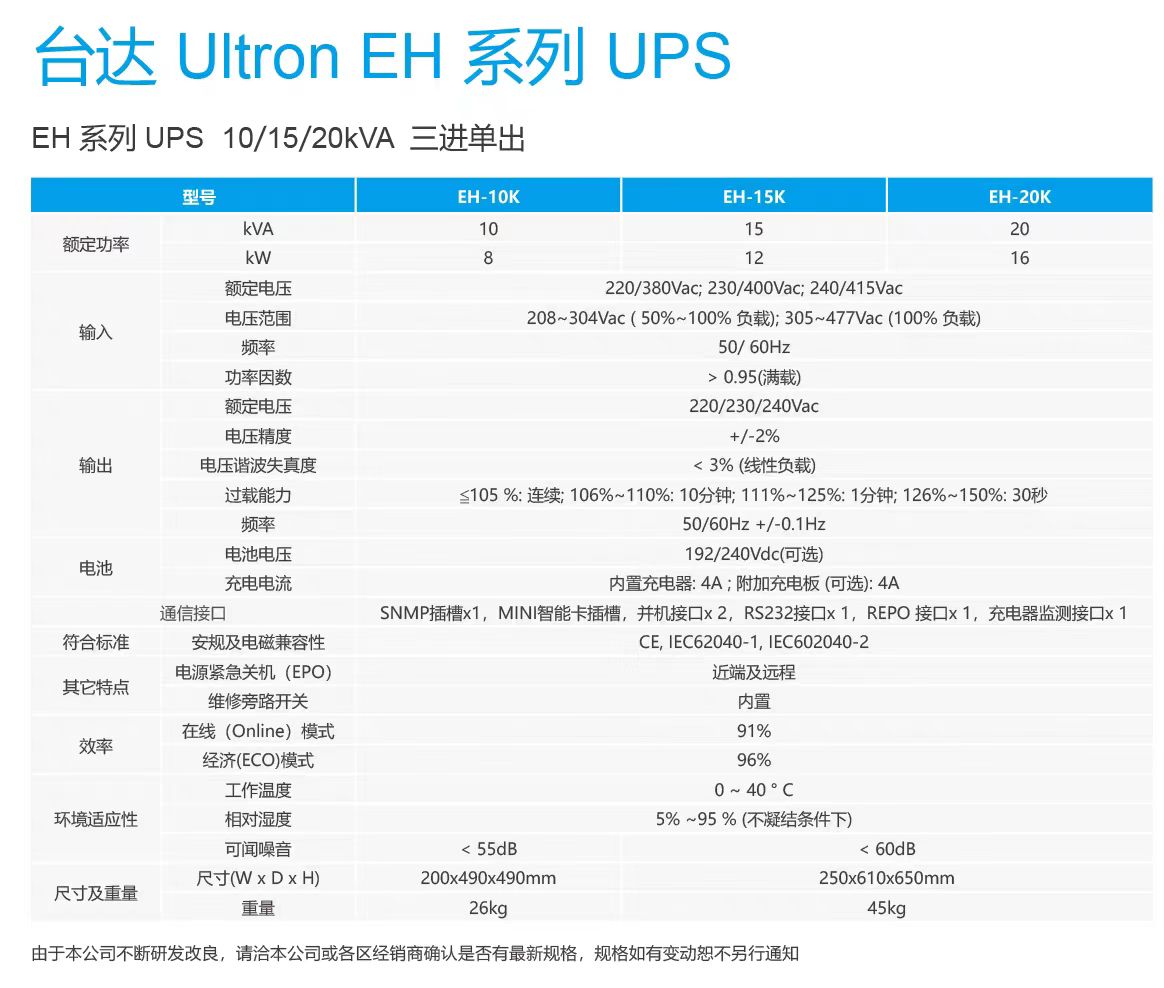 台达UPS电源EH 20K是一款在线式高频机,容量为20KVA(16kW),适用于对电力质量要求较高的关键设备。以下是其主要特点和应用场景的总结: