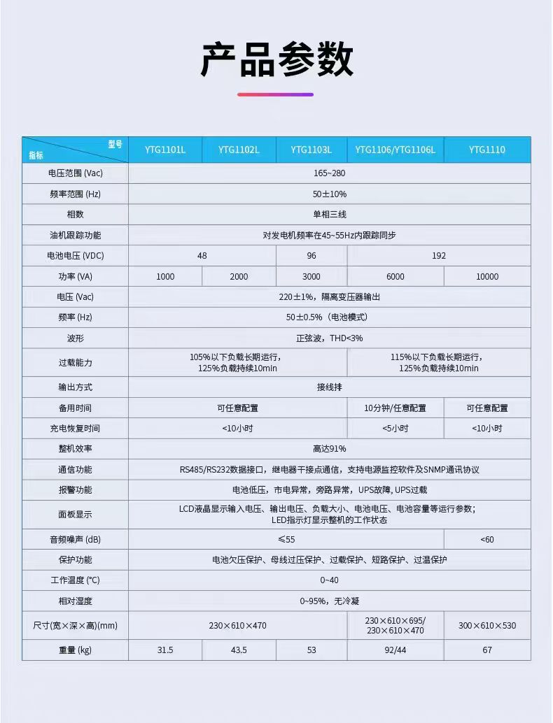 科华(KELONG)UPS电源YTG1110是一款工频机设计的10KVA(千伏安)主机,主要针对网络机房、数据中心等对电力稳定性要求较高的场景。以下是该产品的关键信息及特点解析: