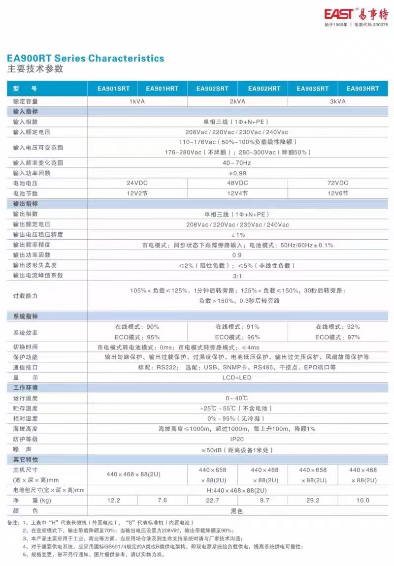 易事特(EAST)EA901HRT是一款1KVA(1000VA)机架式UPS电源,专为网络机房、服务器等关键设备设计,提供稳定可靠的电力保护。以下是该型号的主要特点及技术参数解析: