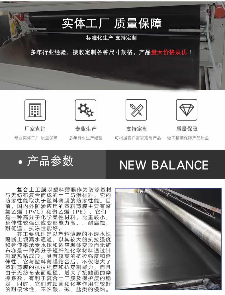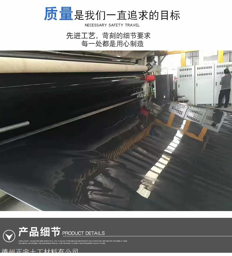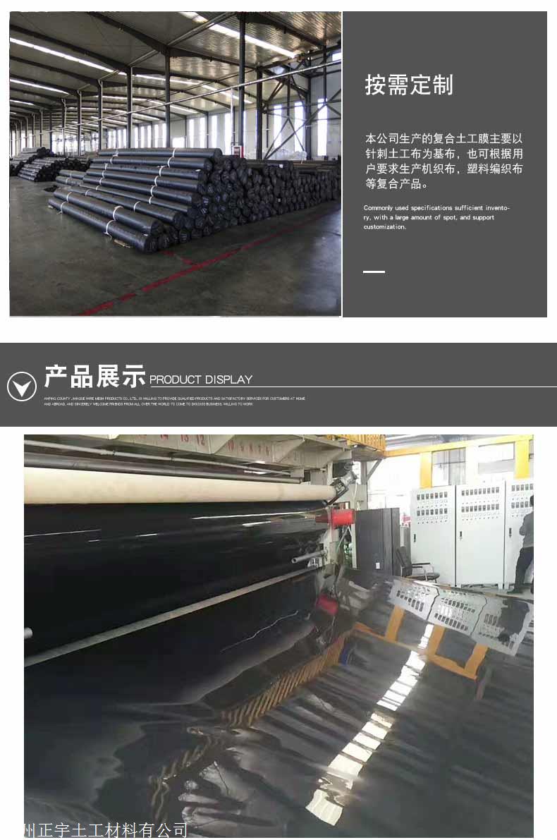二、我公司江西多种类土工材料生产基地企业,生产的高密度聚乙烯2.0mm土工膜,公称厚度2毫米,平均厚度偏差-5%,拉伸屈服强度29N/mm,拉伸断裂强度53N/mm。产品幅宽6米宽或8米宽,每卷长度50米或100米长。该2.0mmHDPE土工膜广泛应用于油罐基础防渗、石化管道防渗,储油罐防渗、油田防渗、事故浆液罐防渗;生活垃圾填埋场、固体废弃物流填埋场、工业垃圾填埋场、有害物填埋场、垃圾填埋场覆盖、卫生垃圾填埋场覆盖、卫生垃圾填埋处理站;金矿防渗、铁矿防渗、铜矿防渗、锂矿防渗、煤矿防渗、尾矿填埋场、溶解池、灰渣场防渗;黑膜沼气池、沼液池、氧化塘、污水储存池;污水处理池、渗滤液调节池、雨水收集池、蓄水池防渗、农业灌溉水池、化工污水池;高尔夫球场景观湖防渗、景观河道、园林水系、景观湖泊、人工湖、景观水池;养鱼池防渗、虾塘、甲鱼池、泥鳅养殖池、黄鳝养殖池、水蛭池养殖。