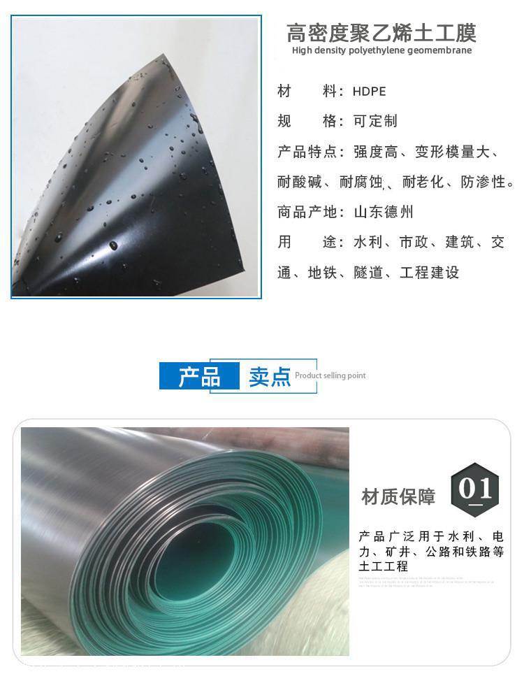 9、产品别名:土工膜、防渗膜、HDPE土工膜、HDPE防渗膜、光面HDPE膜、糙面HDPE膜、高密度聚乙烯膜。