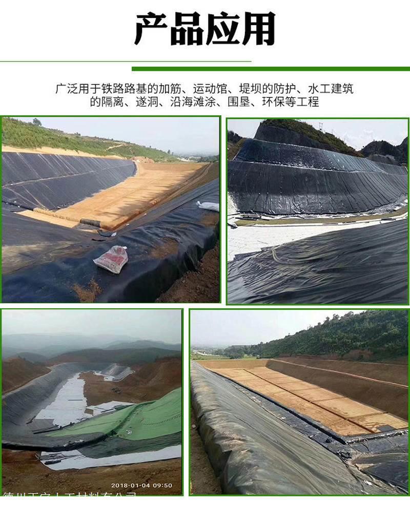 三、我公司是河北的多种类型土工材料生产综合性基地企业,生产的高密度聚乙烯1.5mm防渗膜,平均厚度1.5毫米或1.0毫米,平均厚度偏差-10%,拉伸屈服强度22N/mm,拉伸断裂强度40N/mm。产品幅宽6米宽或8米宽,每卷长度50米或100米长。该种HDPE防渗膜广泛应用于油罐基础防渗、石化管道防渗,储油罐防渗、油田防渗、事故浆液罐防渗;生活垃圾填埋场、固体废弃物流填埋场、工业垃圾填埋场、有害物填埋场、垃圾填埋场覆盖、卫生垃圾填埋场覆盖、卫生垃圾填埋处理站;金矿防渗、铁矿防渗、铜矿防渗、锂矿防渗、煤矿防渗、尾矿填埋场、溶解池、灰渣场防渗;黑膜沼气池、沼液池、氧化塘、污水储存池;污水处理池、渗滤液调节池、雨水收集池、蓄水池防渗、农业灌溉水池、化工污水池;高尔夫球场景观湖防渗、景观河道、园林水系、景观湖泊、人工湖、景观水池;养鱼池防渗、虾塘、甲鱼池、泥鳅养殖池、黄鳝养殖池、水蛭池养殖。