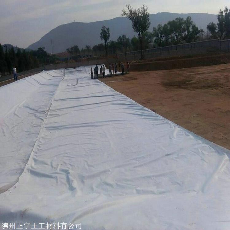 一布一膜,为一层重量为100g-700g/平米的HDPE土工膜,过化学或热粘合上一层200g-600g/平米的无纺土工布为保护层的复合结构;复合土工膜具有很高的抗拉强度和抗导物穿刺能力,并具备了平面排水功能。复合土工膜具有良好的耐热性耐寒性和化学稳定性好,具有较高的抗拉强度,抗老化和抗腐蚀性能。机械拉伸强度好,具有很好的介电性能,耐环境应力开裂性能较好。复合土工膜增加了膜在基层的摩擦系数,防滑性能好。江西300克防水土工布 正宇牌300g不透水土工布 两布一膜 防水