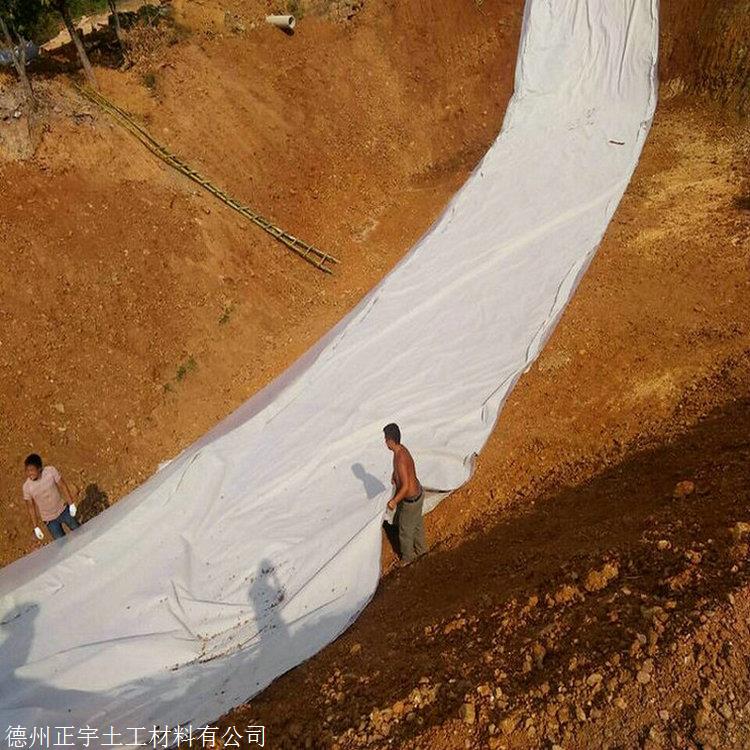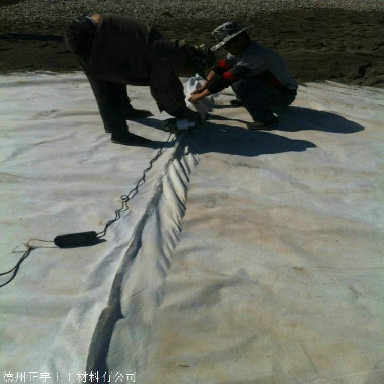 两布一膜,为一层重量为100g-700g/平米的PE防渗膜两面过化学或热粘合工艺,各复合上每面重量为200g-600g/平米的无纺土工布构成,构成了以PE膜为防渗主体,以复合土工布为增强抗拉强度,抗异物穿刺能力强,山东300克防水土工布 正宇牌300g不透水土工布 一布一膜 防渗同时具备了双平面排水功能。复合土工膜具有良好的耐热性耐寒性和化学稳定性好,具有较高的抗拉强度,抗老化和抗腐蚀性能。机械拉伸强度好,具有很好的介电性能,耐环境应力开裂性能较好。复合土工膜增加了膜在基层的摩擦系数,防滑性能好。