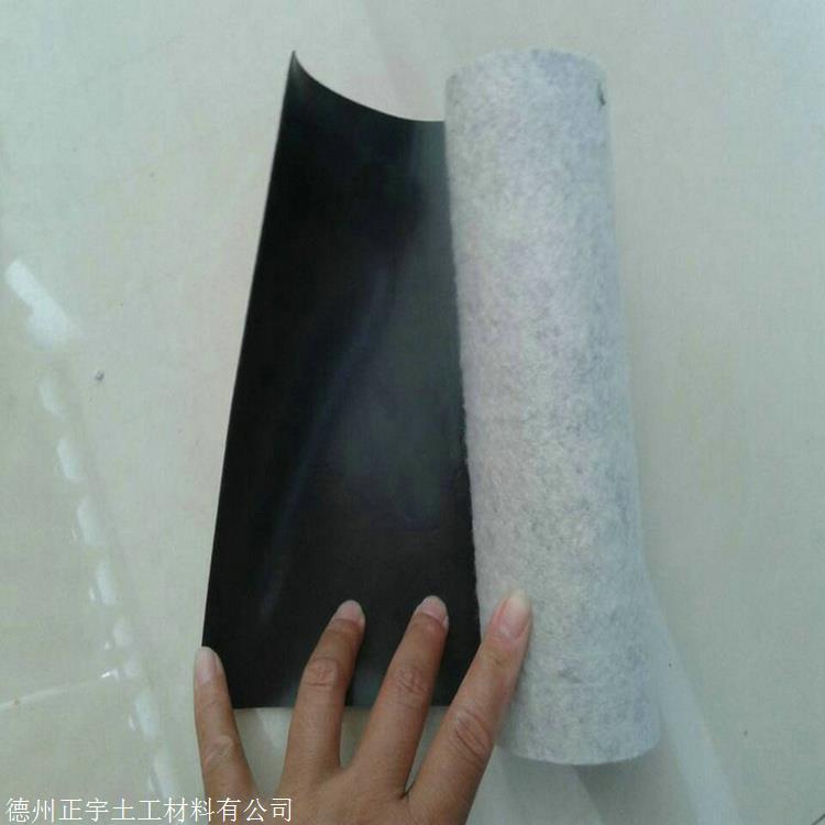 一布一膜,为一层重量为100g-700g/平米的HDPE土工膜,过化学或热粘合上一层200g-600g/平米的无纺土工布为保护层的复合结构;复合土工膜具有很高的抗拉强度和抗导物穿刺能力,并具备了平面排水功能。复合土工膜具有良好的耐热性耐寒性和化学稳定性好,具有较高的抗拉强度,抗老化和抗腐蚀性能。机械拉伸强度好,具有很好的介电性能,耐环境应力开裂性能较好。复合土工膜增加了膜在基层的摩擦系数,防滑性能好。河南300克防水土工布 正宇牌300g不透水土工布 一布一膜 防渗