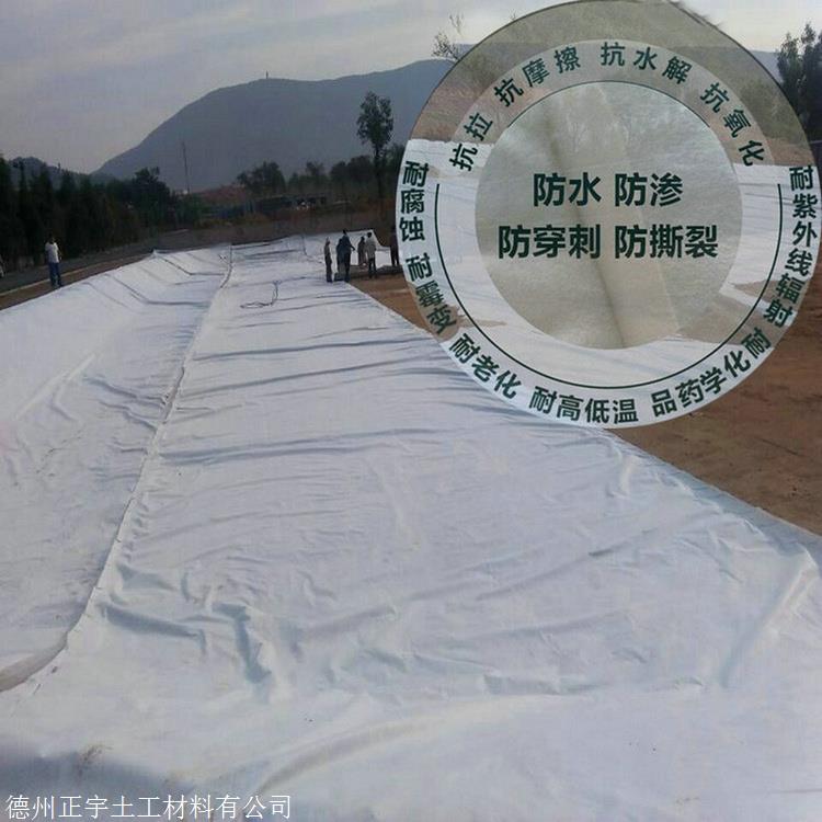 两布一膜,为一层重量为100g-700g/平米的PE防渗膜两面过化学或热粘合工艺,各复合上每面重量为200g-600g/平米的无纺土工布构成,构成了以PE膜为防渗主体,以复合土工布为增强抗拉强度,抗异物穿刺能力强,广东300克防水土工布 正宇牌300g不透水土工布 一布一膜 防渗同时具备了双平面排水功能。复合土工膜具有良好的耐热性耐寒性和化学稳定性好,具有较高的抗拉强度,抗老化和抗腐蚀性能。机械拉伸强度好,具有很好的介电性能,耐环境应力开裂性能较好。复合土工膜增加了膜在基层的摩擦系数,防滑性能好。