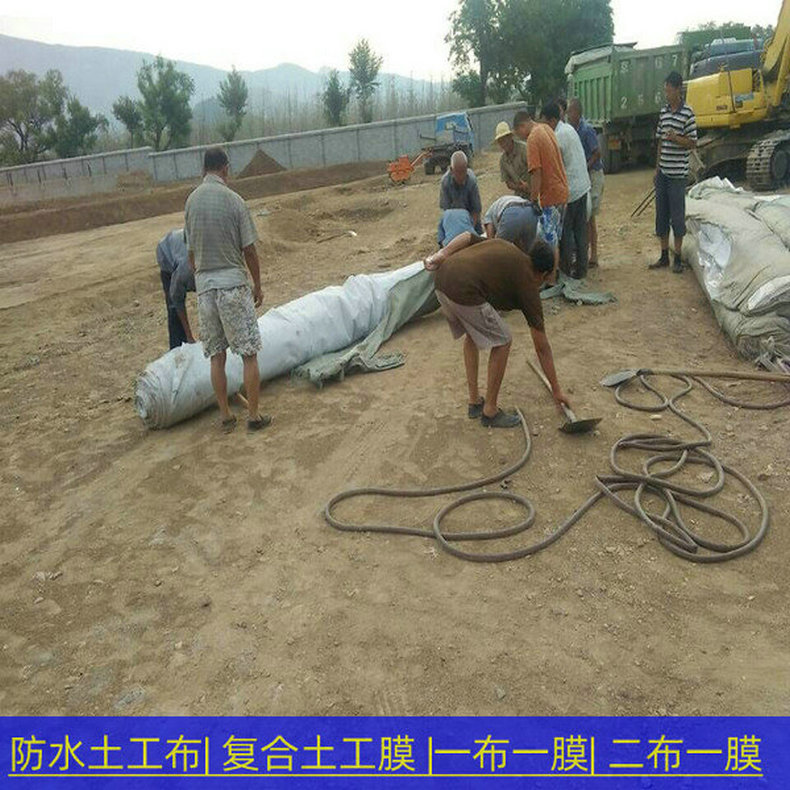 5.所有外露的防渗土工布边缘必须立刻用沙袋或者其他重物压紧,以防止防渗土工布被风吹或被拉出周边锚固沟。防渗土工布不能在大风的天气情况下展开,以防止被风吹起。 800克复合防水土工布生产批发,150g/0.5mm/150g两布一膜,山东