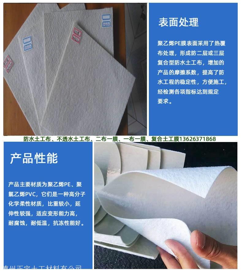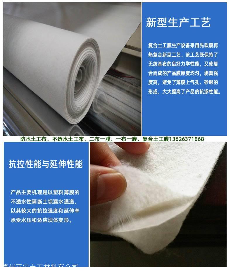 德州正宇土工材料有限公司300克二布一膜是以塑料薄膜作为防渗基材,与无纺布复合而成的土工防渗材料。它的防渗性能主要取决于塑料薄膜的防渗性能。目前防渗应用的塑料薄膜,主要有聚氯乙烯(PVC)和聚乙烯(PE),它们是一种高分子化学柔性材料,比重较小,延伸性较强,适应变形能力高,耐腐蚀,耐低温,抗冻性能好。膜的厚度一般为0.30-2.00mm。主要机理是以塑料薄膜的不透水性隔断土坝漏水通道,以其较大的抗拉强度和延伸率承受水压和适应坝体变形。而无纺布亦是一种高分子纤维化学材料,通过针刺或热粘成形,具有较高的抗拉强度和延伸性。目前应用于复合的无纺布主要有:涤纶短纤针刺土工布、聚酯长丝纺粘土工布、扁丝塑编布等。它与塑料薄膜结合后,不仅增大了塑料薄膜的抗拉强度和抗穿刺能力,而且由于无纺布表面粗糙,增大了接触面的摩擦系数,有利于300克二布一膜及保护层的稳定。同时,它们对细菌和化学作用有较好的耐侵蚀性,不怕酸、碱、盐类的侵蚀。