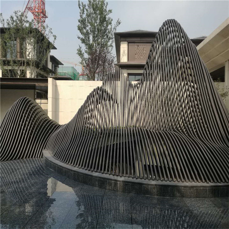 随着雕塑行业的发展,不锈钢假山雕塑更多的取代了石头假山的地位,很受小区的青睐,常见的不锈钢假山雕塑包括不锈钢管制作的假山、不锈钢板制作的层叠假山、锻打成型的假山等等。使用不锈钢管制作的假山雕塑,一般以拉丝效果为常见,常和水景结合,过变化,还可以做成假山坐凳造型。